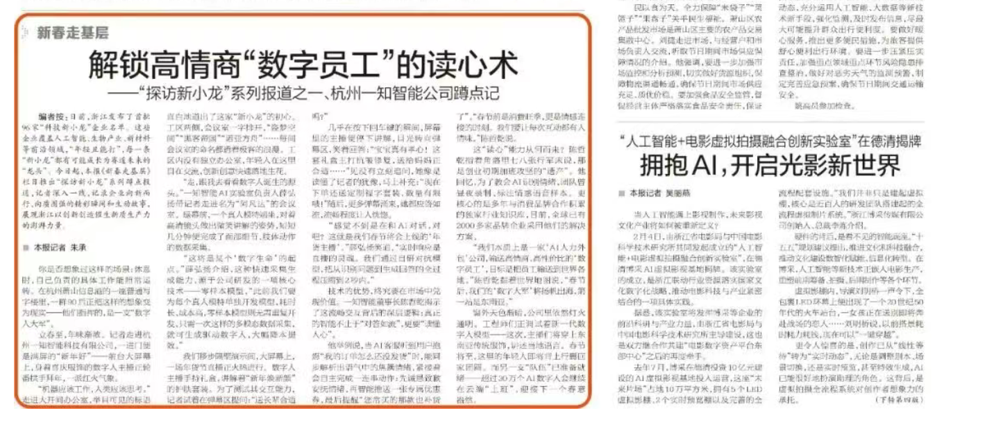 2月5日,《浙江日报》在头版以《“探访新小龙”系列报道① 杭州一知智能公司蹲点记:解锁高情商“数字员工”的读心术》为题,对萧经开企业...