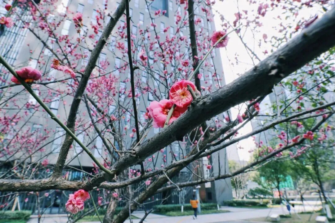 梅枝与科研楼宇并肩伫立